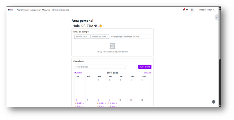 Al ingresar, encontrarás la pantalla principal con el calendario de actividades que tienen fecha límite de entrega. Así organizas tus tareas fácilmente.