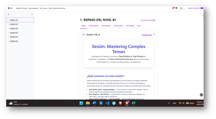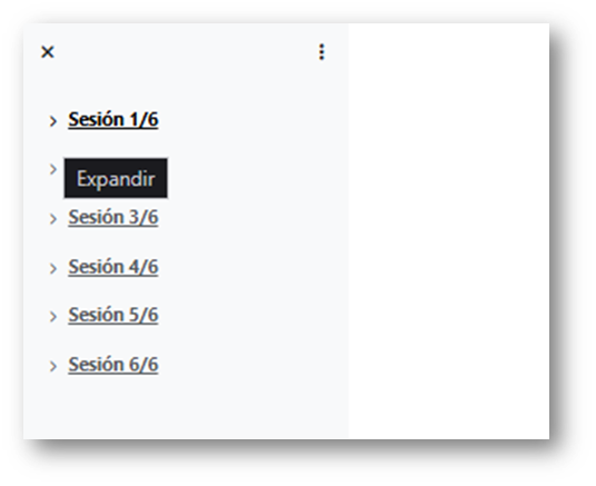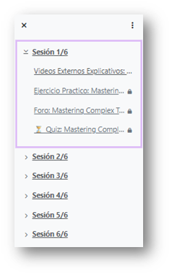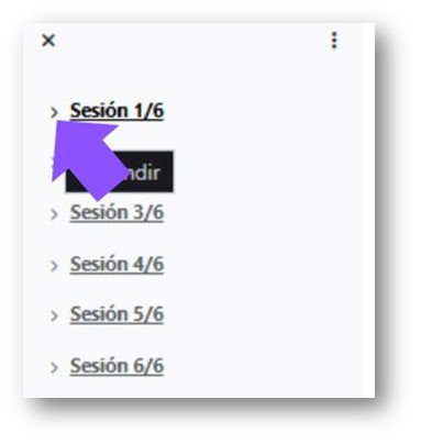 Si presionas el Click izquierdo del mouse sobre la flecha que está a la izquierda del nombre de la sesión, se desplegará una lista del contenido de la Sesión (temas, recursos, actividades).