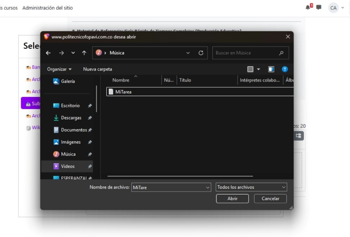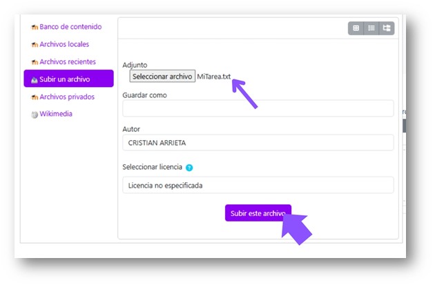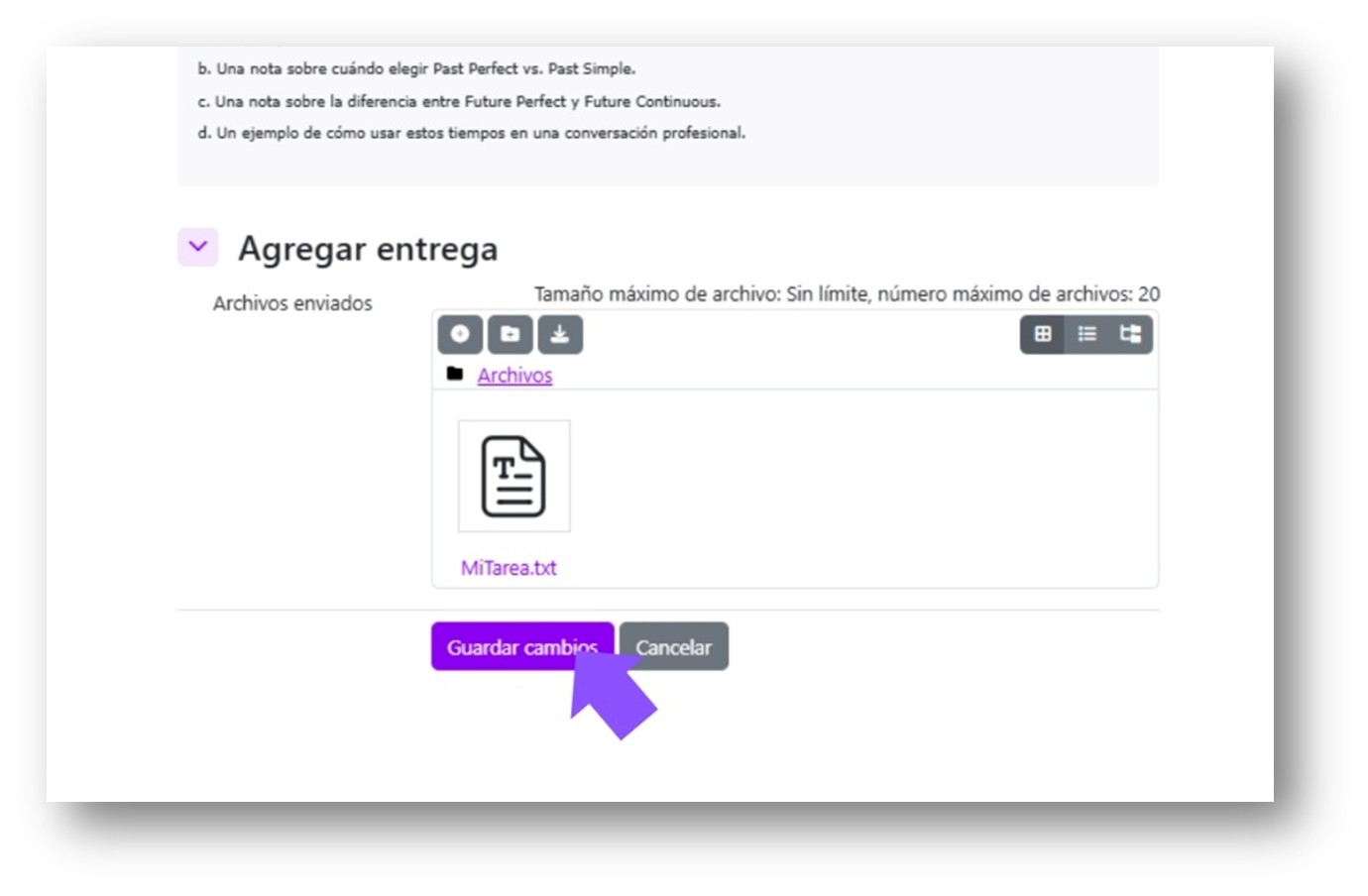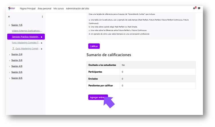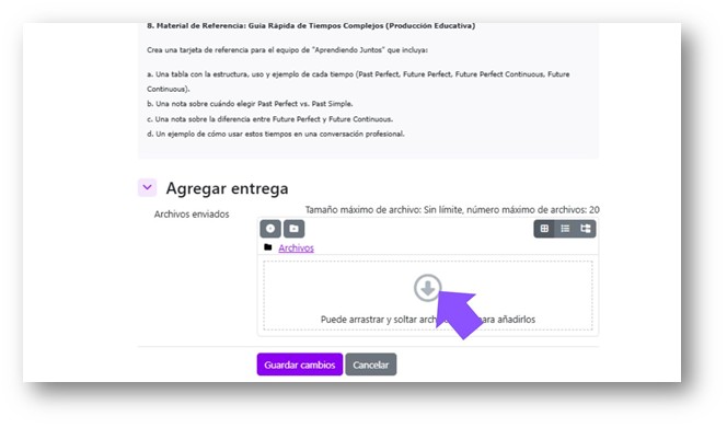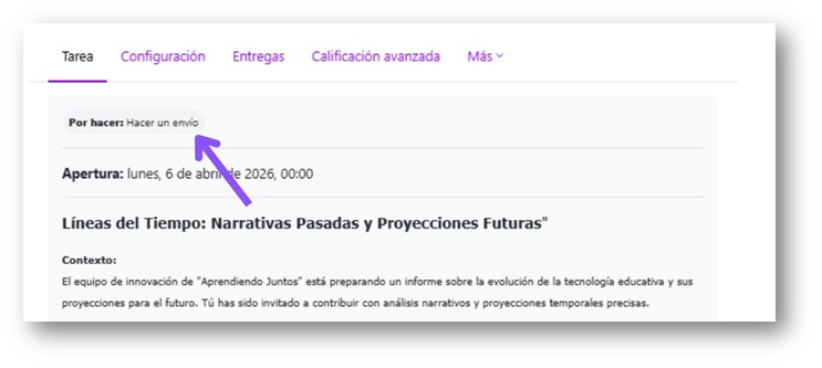 Al ingresar a una actividad, en la parte superior se indican los requisitos para que se marque como hecha. Es importante cumplir con cada condición (visualización de contenido, envío de archivo, etc.)