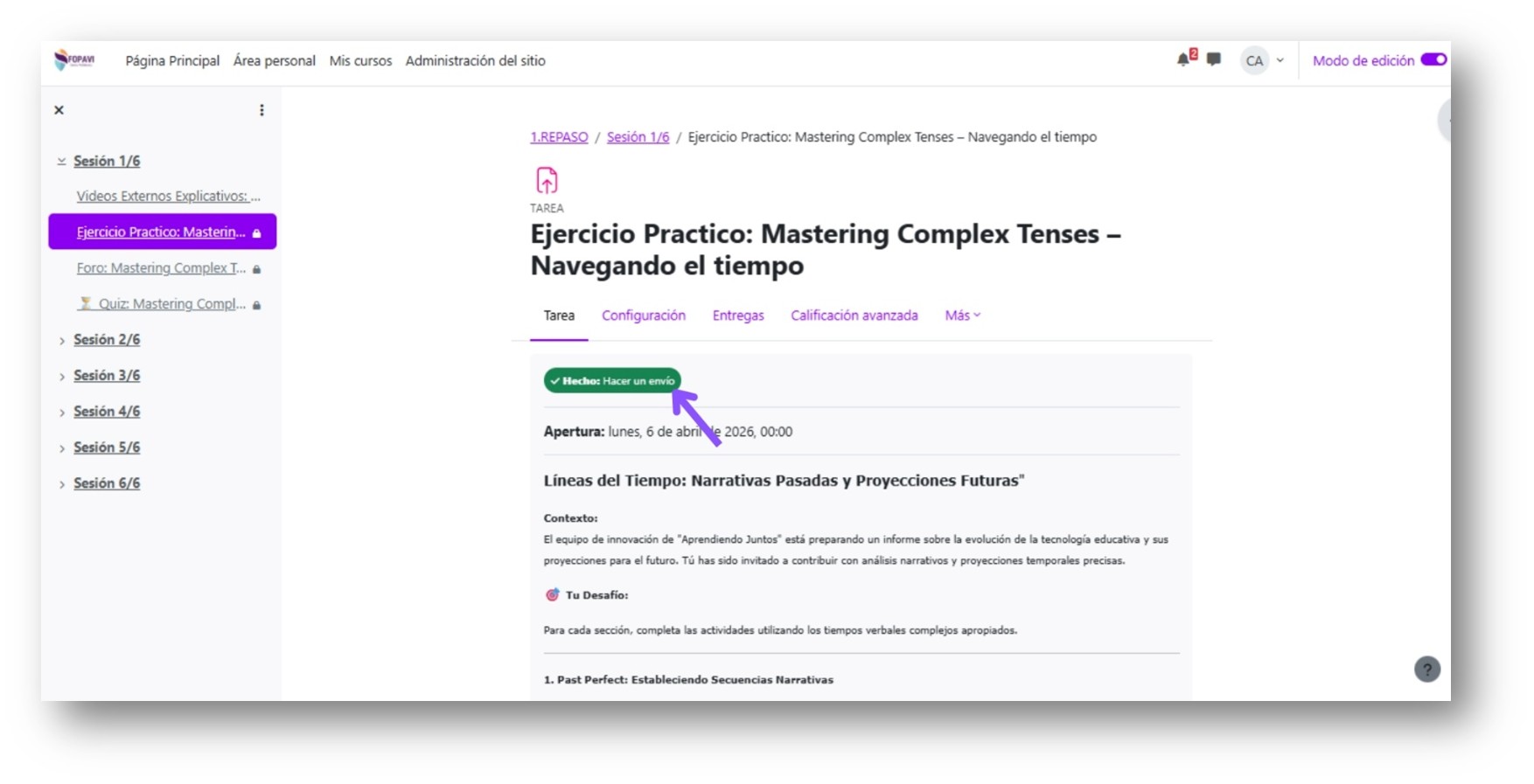 8. Al terminar de leer y entender el tema de la sesión, llegarás a un botón que al darle click te llevará a la primera actividad a realizar.